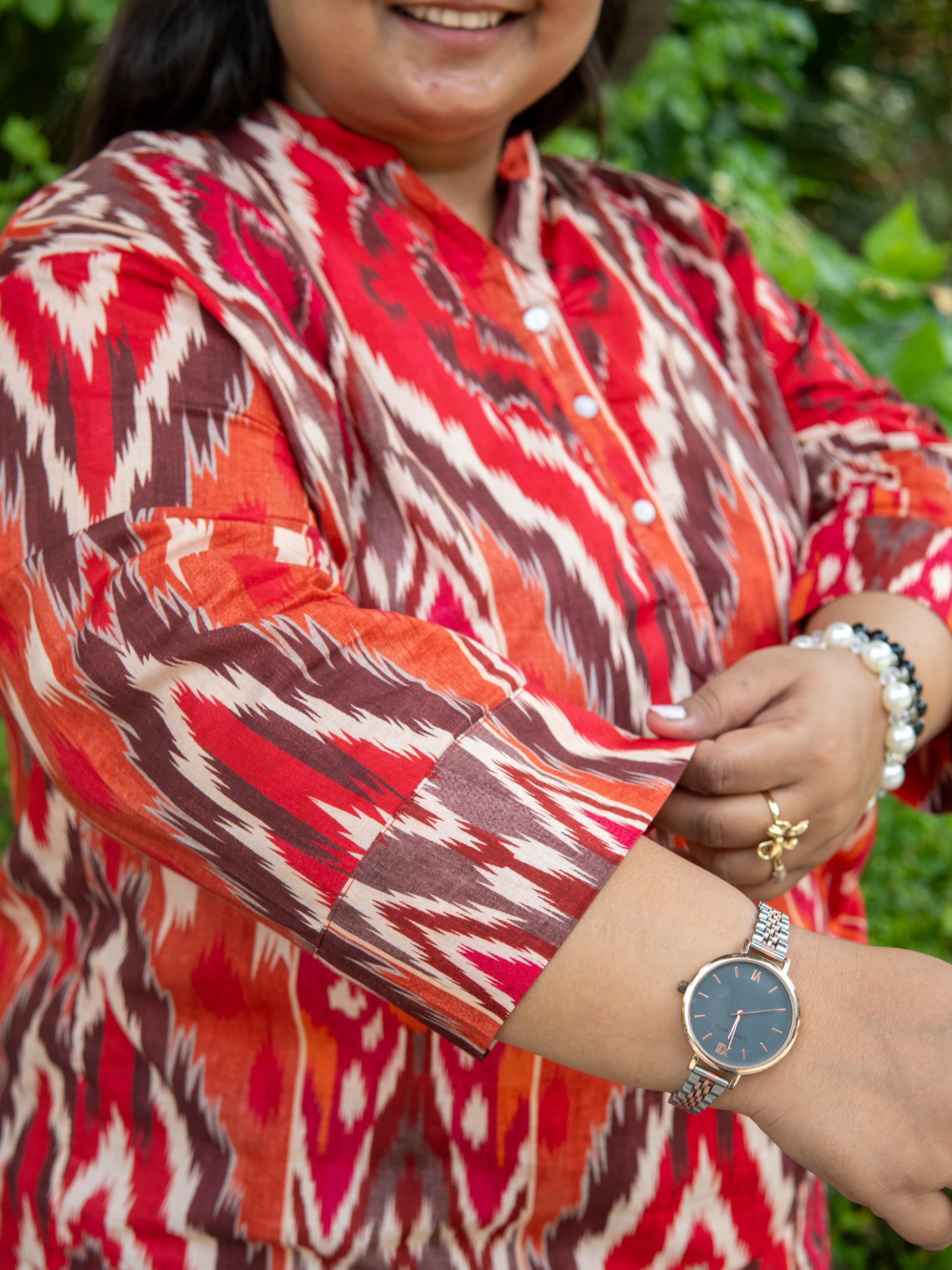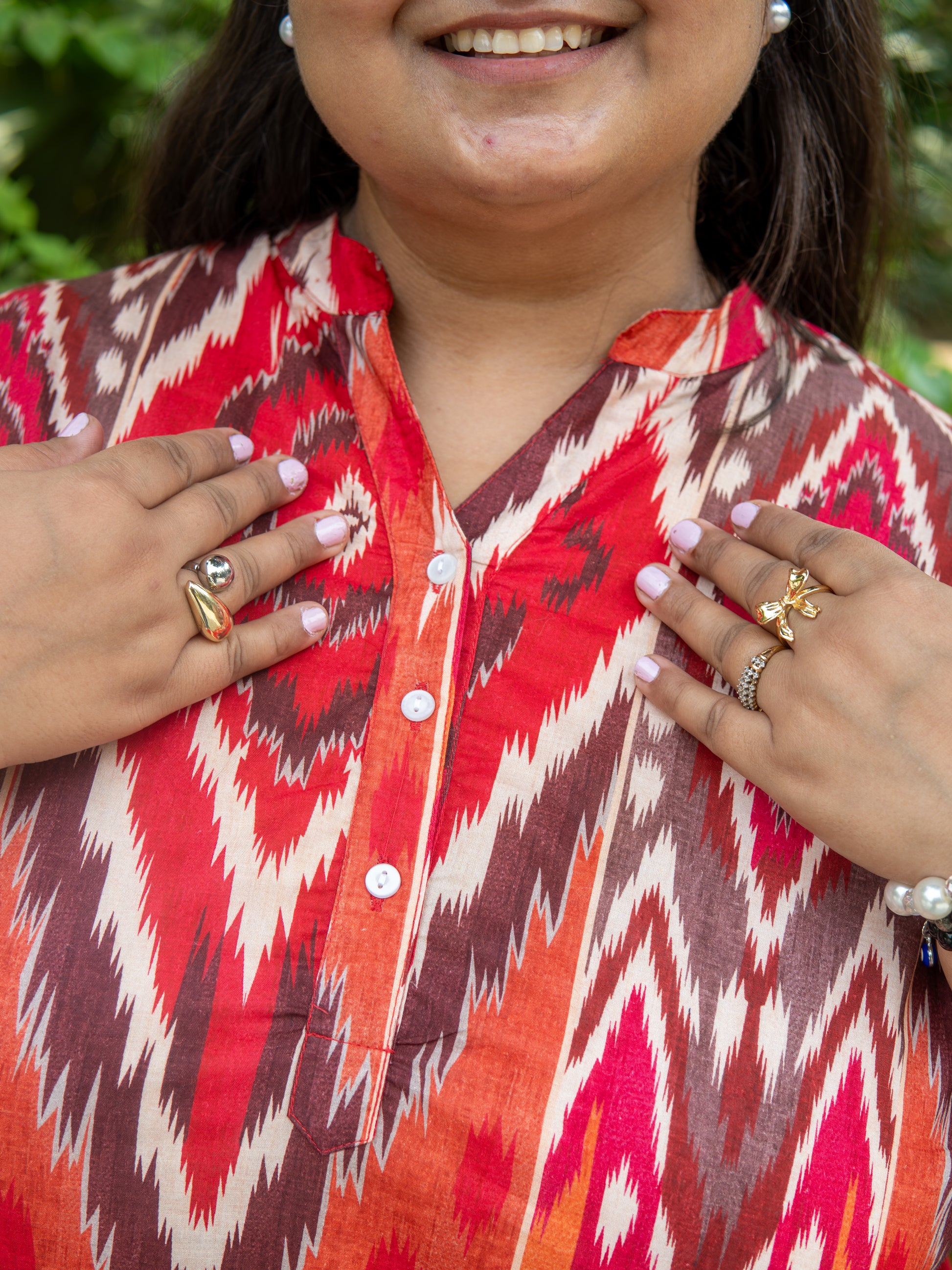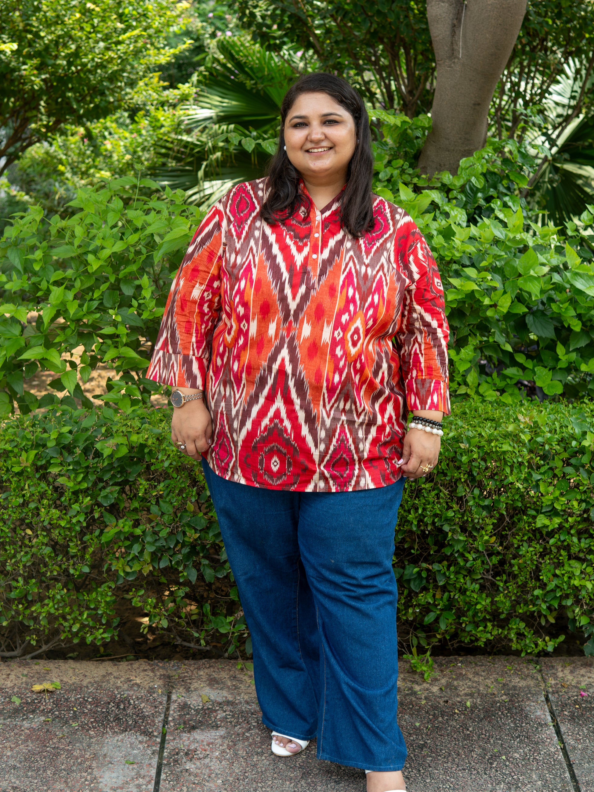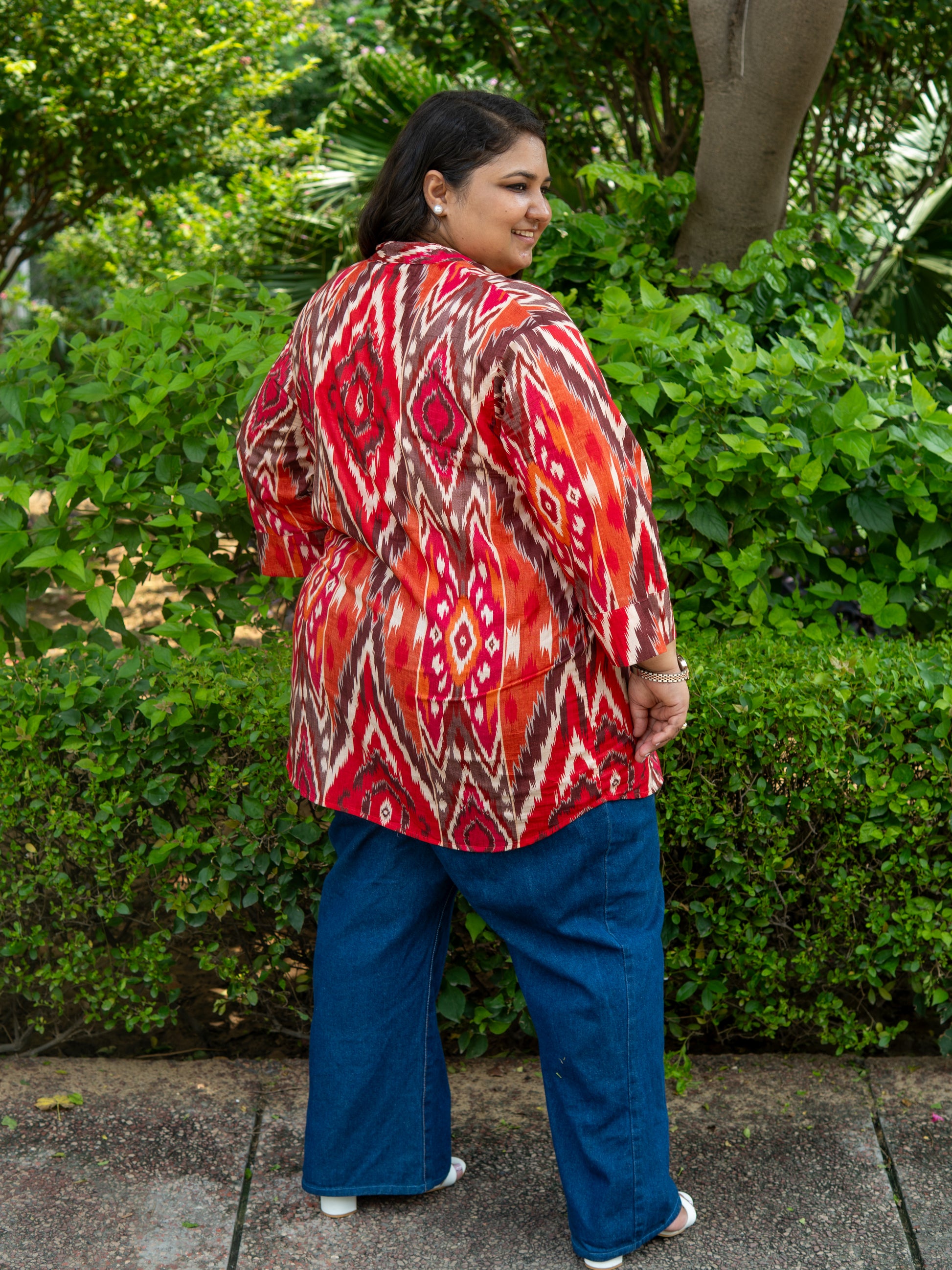 Elevate your everyday style with this vibrant ikat-inspired kurta-style top. Crafted in breathable cotton, this piece blends comfort with striking design. The bold red, orange, and earthy tones create a dynamic geometric pattern that adds a touch of modern flair to traditional prints.